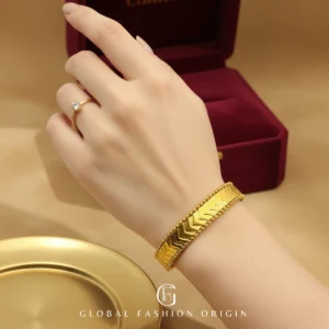 A sculpted masterpiece in 18K gold plating, the Aurora Bangle blends intricate detailing with bold elegance — designed to make every look unforgettable.