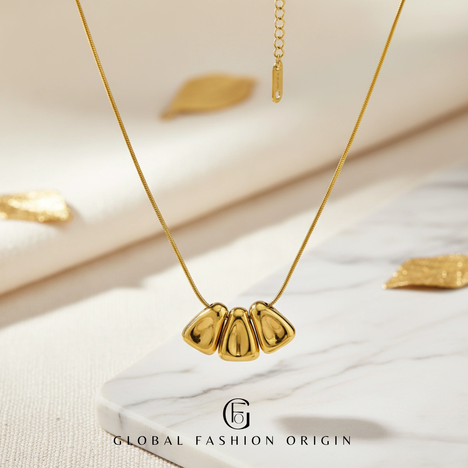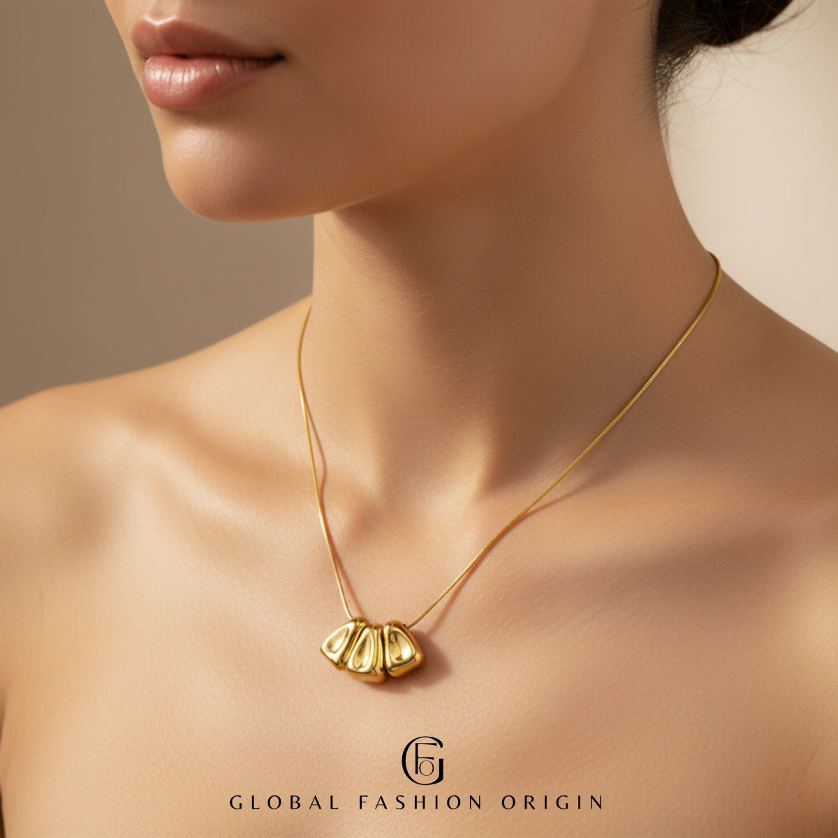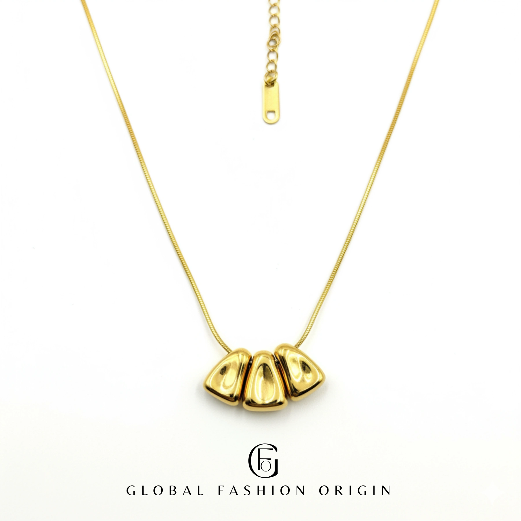 Crafted with precision and plated in 18K gold, this piece features three sculpted bead-like forms that exude strength and elegance in perfect harmony.