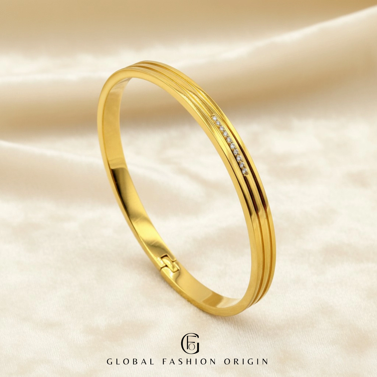 Elevate your elegance with the Luxe 18K Gold Plated Crystal Line Bangle by Global Fashion Origin. Crafted with precision and plated in premium 18K gold, this bracelet embodies refined minimalism. The smooth dual-line detailing and a delicate row of sparkling crystals make it a statement of understated luxury.