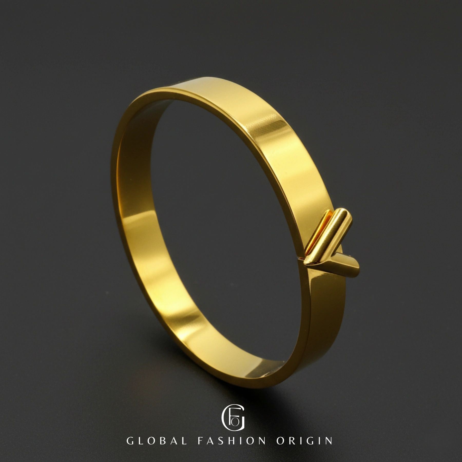 The Aurea Bold ‘V’ Bracelet is a modern classic — sleek, structured, and effortlessly sophisticated. Crafted in premium stainless steel and finished with 18K gold plating, it offers lasting shine and resistance to tarnish. The distinctive ‘V’ design symbolizes victory and vision — perfect for those who wear confidence as their signature.